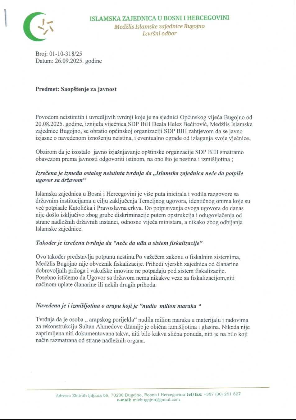 Medžlis Islamske zajednice Bugojno oglasio se zvaničnim saopćenjem za javnost, reagirajući na navode vijećnice SDP-a BiH Deale Helez Bećirović, iznesene na sjednici Općinskog vijeća Bugojno 20. augusta ove godine. U saopćenju, Medžlis oštro odbacuje tvrdnje vijećnice, navodeći da su "neistinite, uvredljive i izmišljene".