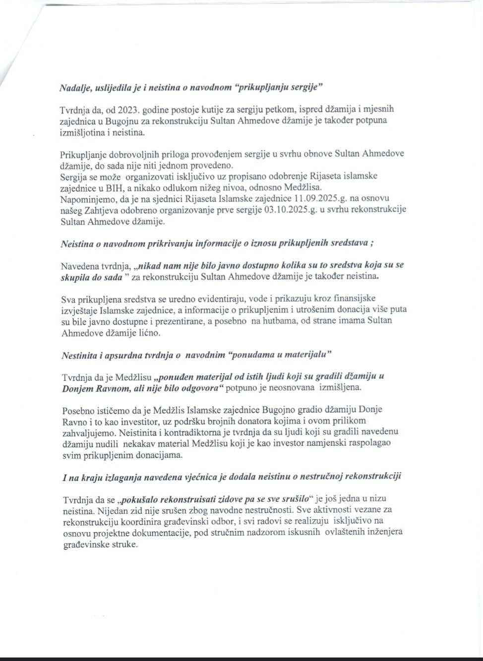 Kao potpunu izmišljotinu, Medžlis odbacuje i navod da je "neki Arap nudio milion maraka" za rekonstrukciju Sultan Ahmedove džamije. Kako stoji u saopćenju: "Nikada nije zaprimljena niti dokumentovana takva ponuda, niti je bilo kakva slična ponuda ikada razmatrana od strane nadležnih organa."