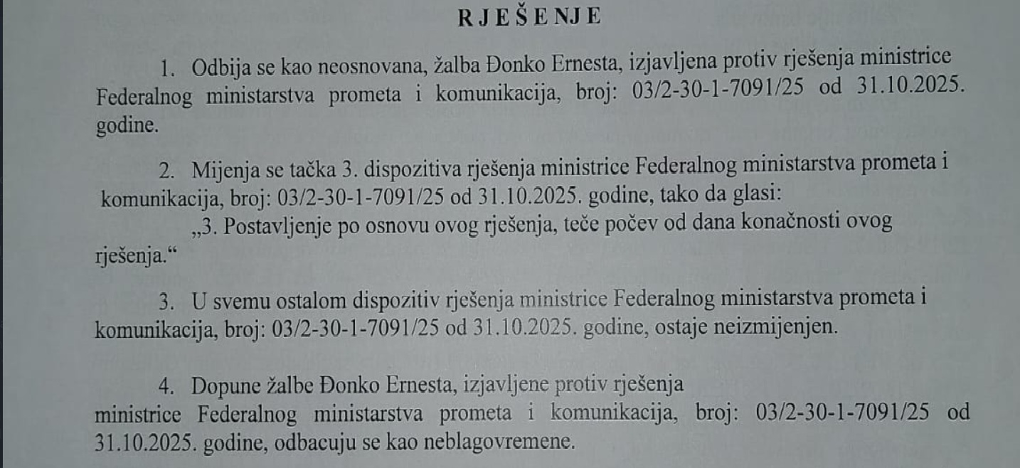 Nakon 110 dana, prijava inspekciji, natpisa u medijima, urgencija na žalbe, Odbor državne službe za žalbe Federacije Bosne i Hercegovine donio je rješenje kojim se odbija žalba Ernesta Đonke zbog njegove degradacije na radnom mjestu u Federalnom ministarstvu prometa i komunikacija.