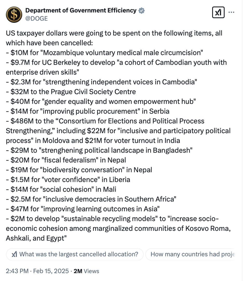 "Dolari američkih poreskih obveznika trebali su biti potrošeni na sljedećim projektima i svi su otkazani", piše na početku objave DOGE-a.
