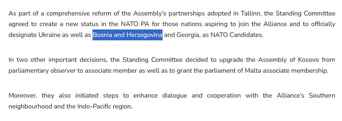 Parlamentarna skupština Sjevernoatlantskog saveza je na svom zasjedanju u Talinu, glavnom gradu Estonije, donijela tu odluku.