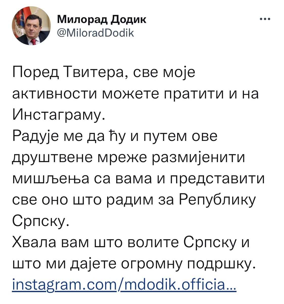 Milorad Dodik, član Predsjedništva Bosne i Hercegovine i lider SNSD-a na svim je Twitter nalogu objavio da je otvorio profil i na Instagramu.
