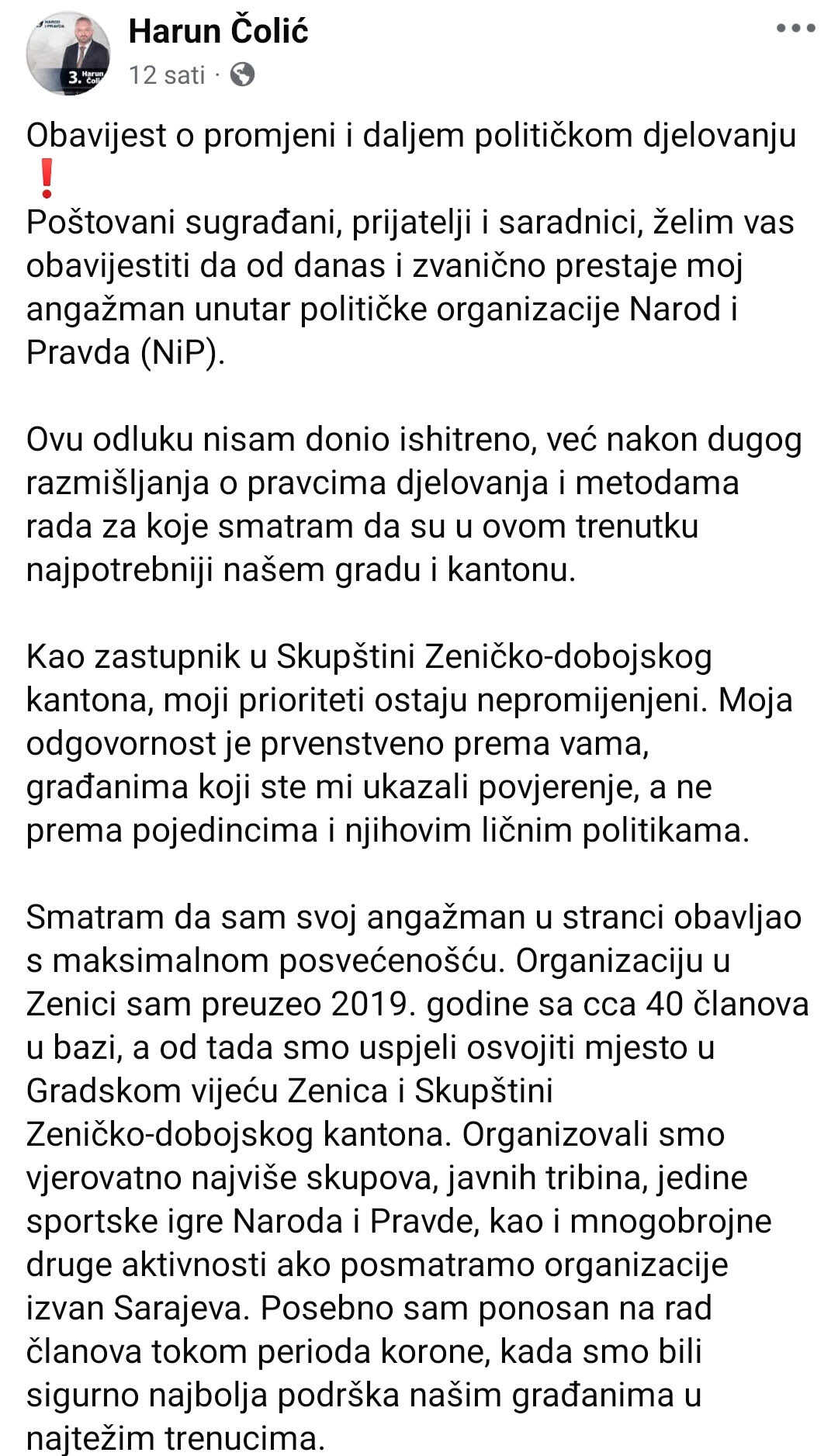Poštovani sugrađani, prijatelji i saradnici, želim vas obavijestiti da od danas i zvanično prestaje moj angažman unutar političke organizacije Narod i Pravda (NiP).
