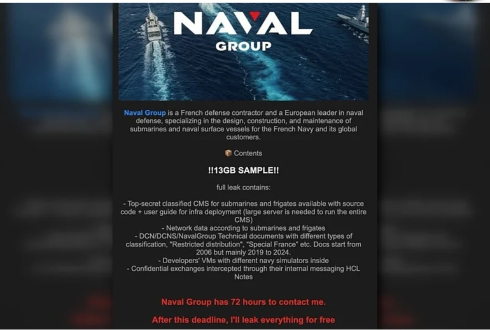 Naval Group je u subotu navečer potvrdio da je bio meta "napada na reputaciju" u kontekstu međunarodnih, poslovnih i informativnih tenzija, ali je naglasio da nije uočen upad u njihove informacione sisteme, niti je upućen bilo kakav zahtjev za otkupninu.