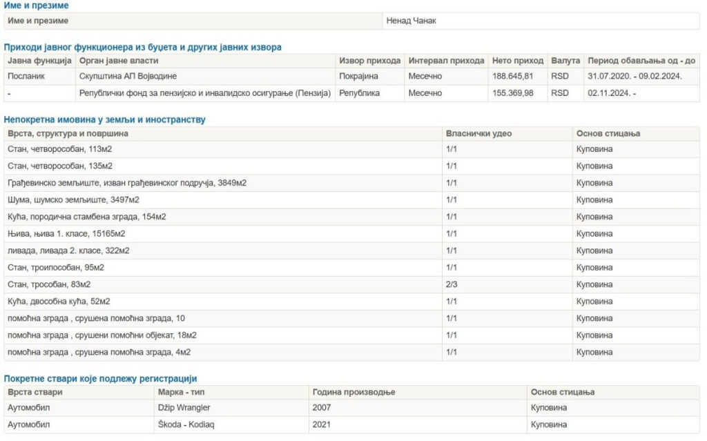 Pored imovine, evidentirana su i njegova primanja. Nakon političke karijere, Čanak je otišao u penziju krajem 2024. godine, s mjesečnim iznosom od oko 155.000 dinara, što je nekih 1.300 eura.