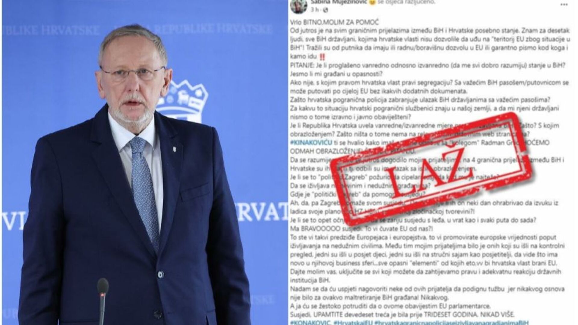 Na društvenim mrežama danas se počela širiti dezinformacija da se državljanima BiH zabranjuje ulazak u Hrvatsku, što je izazvalo veliku paniku među građanima, pogotovo u ovom osjetljivom političkom momentu.