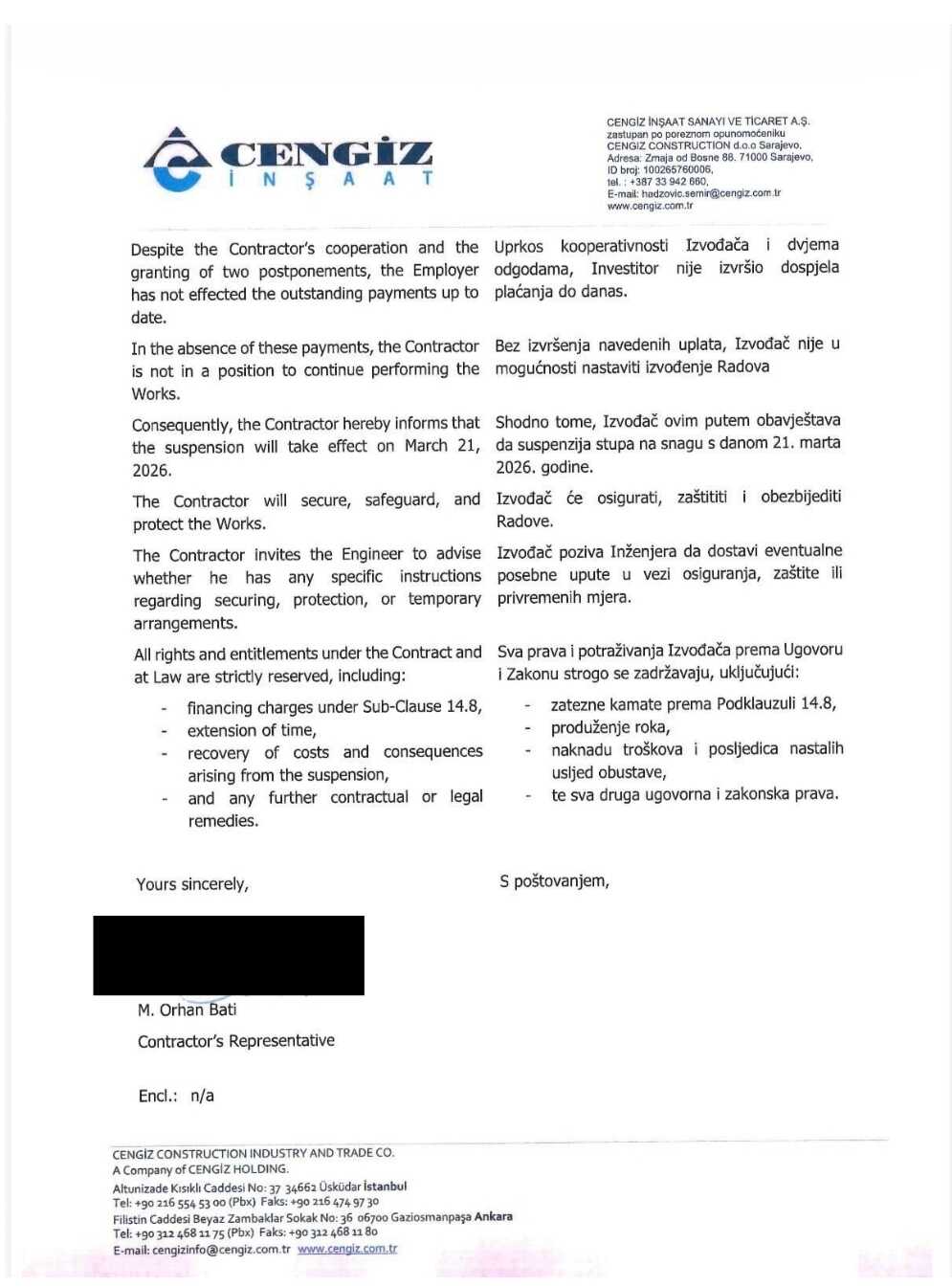 “Uprkos kooperativnosti Izvođača i dvjema odgodama, Investitor nije izvršio dospjela plaćanja do danas. Bez izvršenja navedenih uplata, Izvođač nije u mogućnosti nastaviti izvođenje Radova. Shodno tome, Izvođač ovim putem obavještava da suspenzija stupa na snagu s danom 21. marta 2026. godine. Izvođač će osigurati, zaštititi i obezbijediti Radove. Izvođač poziva Inženjera da dostavi eventualne posebne upute u vezi osiguranja, zaštite ili privremenih mjera. Sva prava i potraživanja Izvođača prema Ugovoru i Zakonu strogo se zadržavaju, uključujući: zatezne kamate prema Podklauzuli 14.8; produženje roka; naknadu troškova i posljedica nastalih usljed obustave, te sva druga ugovorna i zakonska prava”, navodi se u dopisu koji su iz Cengiza uputili generalnom direktoru Autocesta FBiH Denisu Lasiću, izvršnom direktoru Asmiru Dževlanu i predstavniku preduzeća Alemu Kovačeviću.