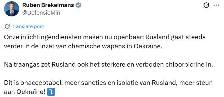 Prema navodima službi, upotreba hemijskog oružja je sada uobičajena. Brekelmans upozorava da upotreba ovih vrsta oružja ne bi trebala biti normalizovana.