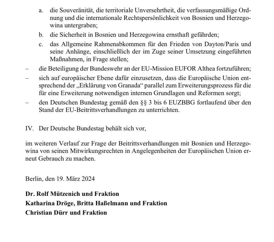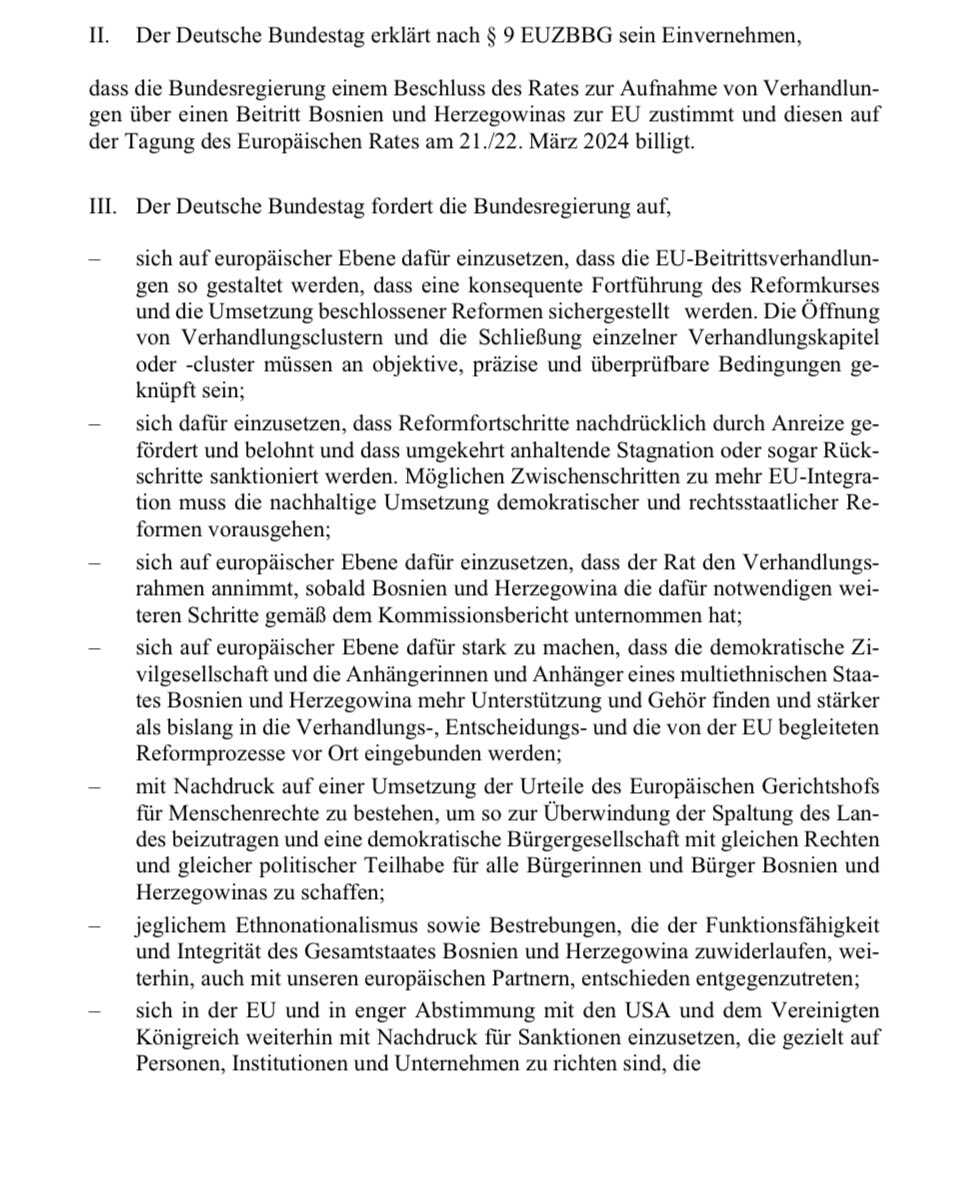 U prijedlogu zaključaka, Vlada Njemačke je Bundestagu predložila da odobri i zaključak kojim se prihvata Pregovarački okvir BiH s EU kada se provedu daljnje reforme koje traži Evropska komisja.