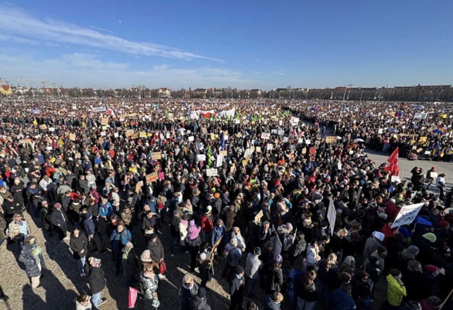 Demonstracije na Theresienwieseu u Minhenu, gdje se svake godine održava Oktoberfest, okupio je znatno više ljudi nego što se očekivalo, javlja njemačka novinska agencija dpa. Organizatori događaja procjenjuju da bi gomila mogla biti do 320.000 ljudi, od kojih su mnogi nosili natpise protiv AfD-a sa sloganima poput: "Rasizam i mržnja nisu alternativa".