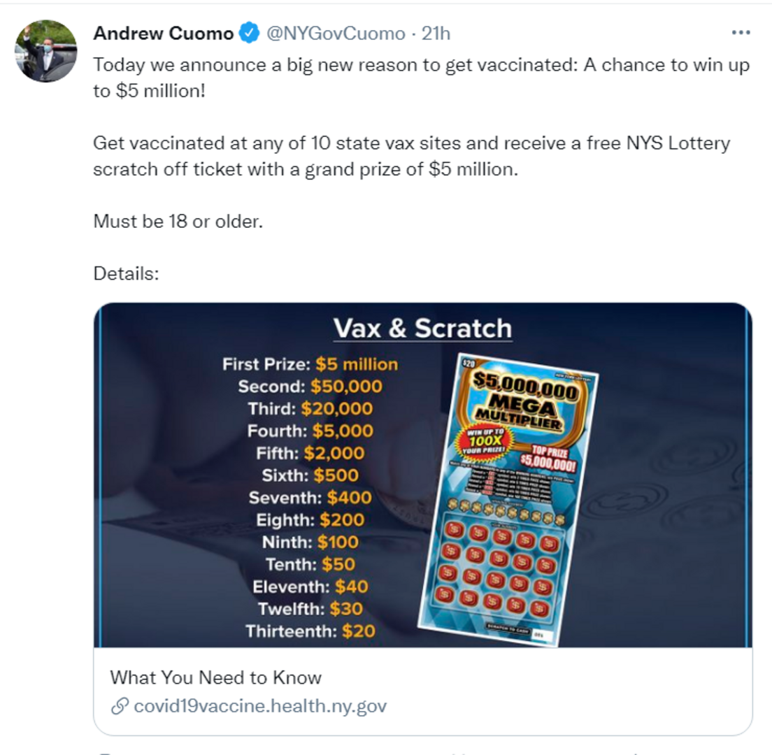 "Vakcinišite se i dobit ćete priliku da osvojite 5 miliona dolara", stoji u objavi guvernera američke savezne države Njujork, Andrewa Cuoma.