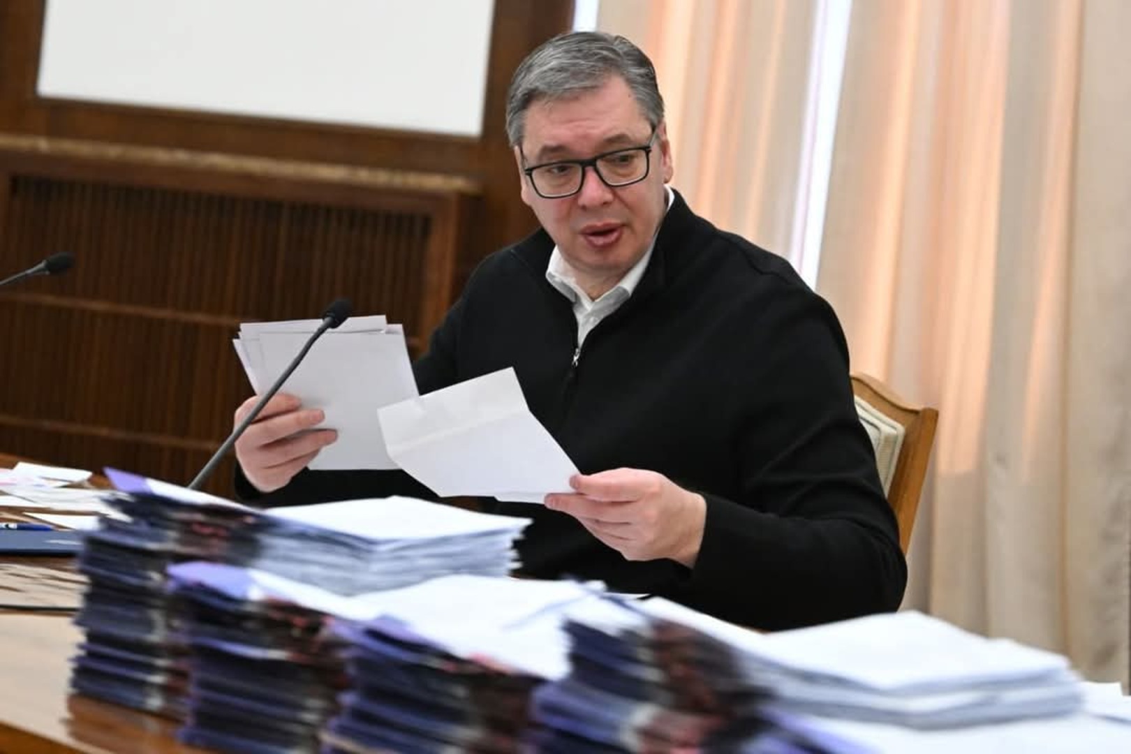 Predsjednik Srbije Aleksandar Vučić primio je pristupnice za novi "Pokret za narod i državu" i čitao pisma i poruke koje su, kako tvrdi, građani ostavljali tokom sabora „Ne damo Srbiju“ na štandovima u centru Beograda.