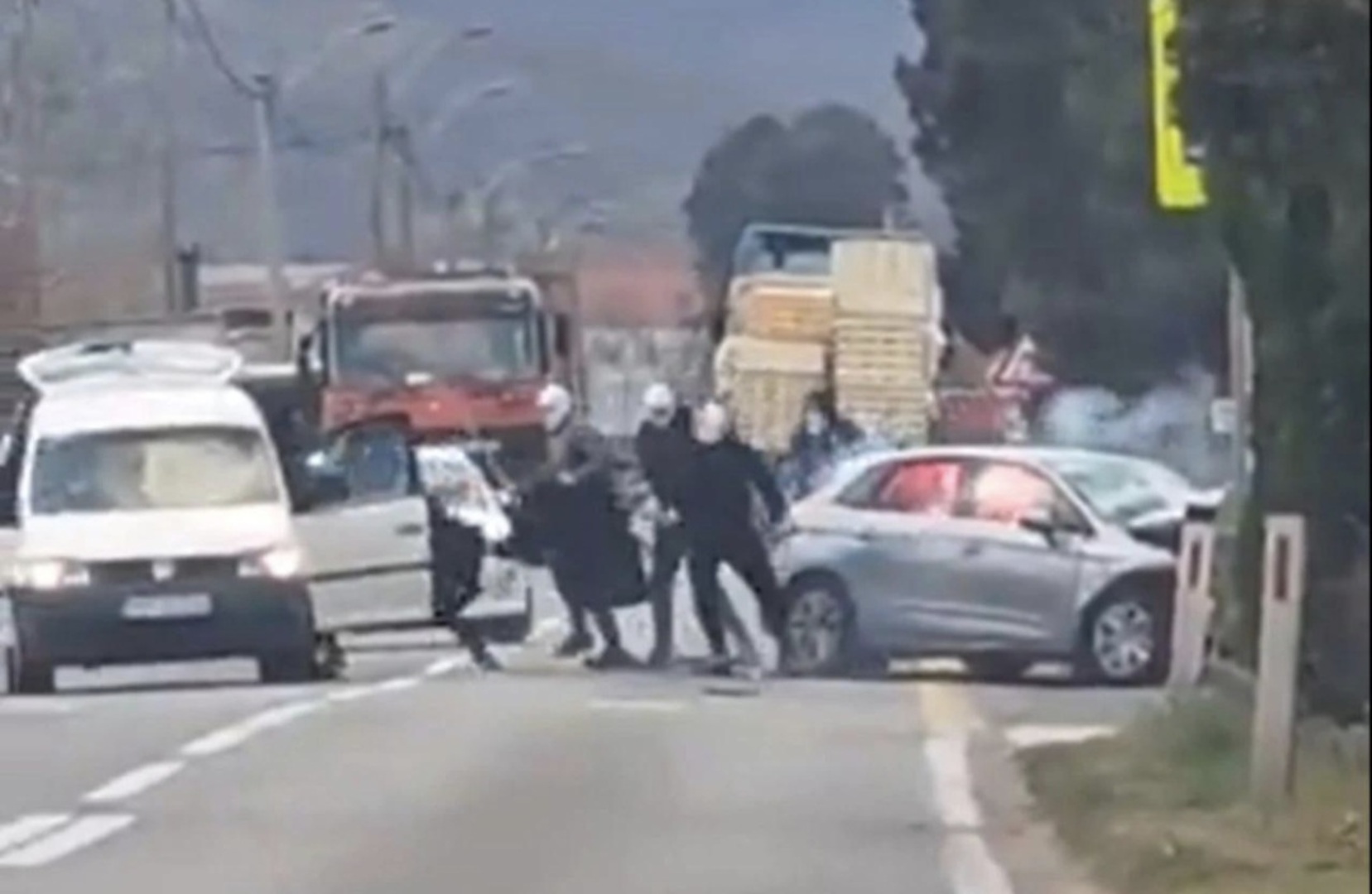 Nekoliko osoba s fantomkama zaustavili su vozilo na cesti, nakon čega su palicama i bakljama razbili vozilo i fizički nasrnuli na vozača.
