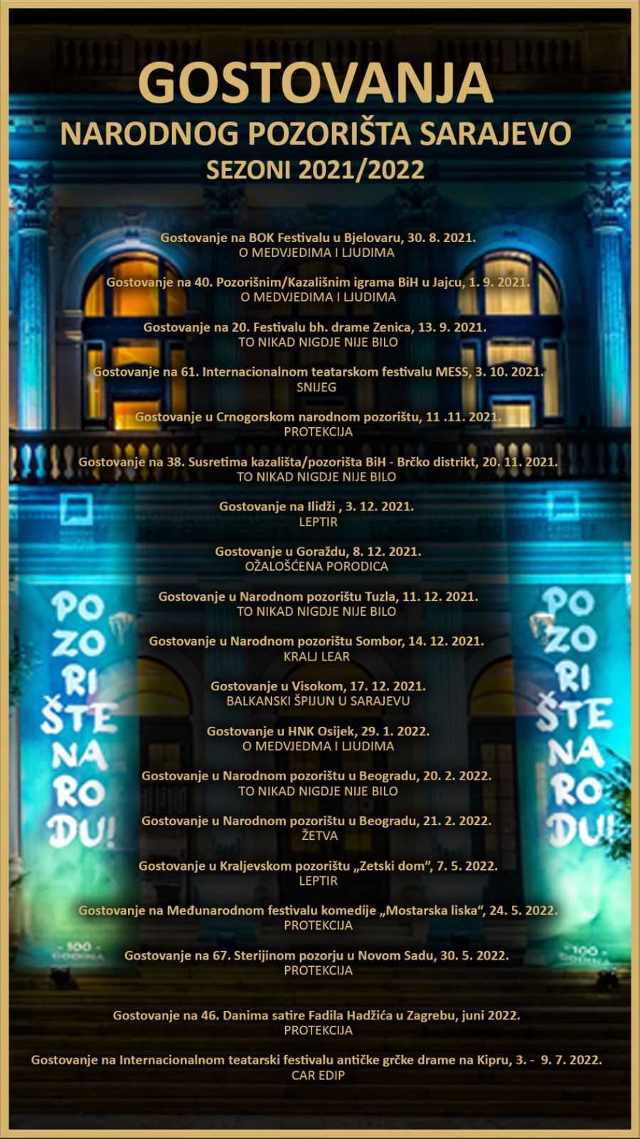 Do kraja sezone, odnosno ove godine, Narodno pozorište Sarajevo uzeti će učešće na festivalima ali i realizirati gostovanja na Kipru, u Barceloni, Istanbulu, Ankari, Bratislavi, Prizrenu, Mariboru, Ljubljani, Rijeci, Zagrebu, Slavonskom Brodu i na Cetinju.
