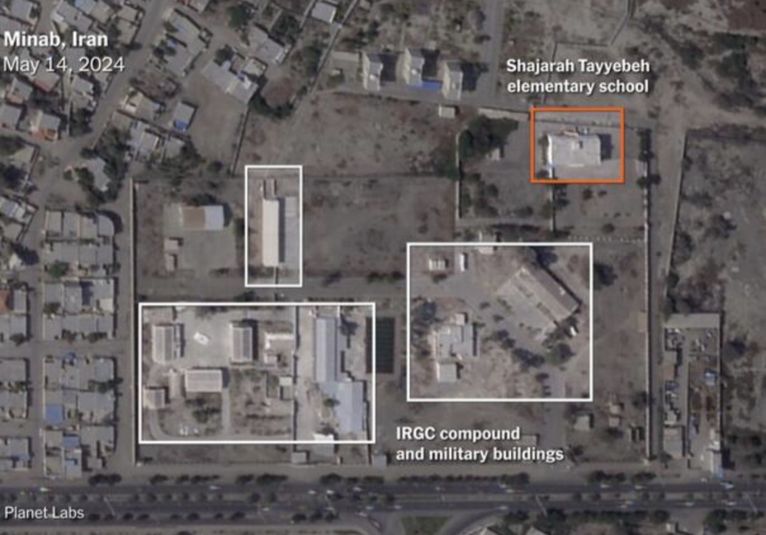Satelitske snimke pokazuju da je školska zgrada pogođena "savršeno preciznim udarima" zajedno s nekoliko objekata unutar baze IRGC-a.