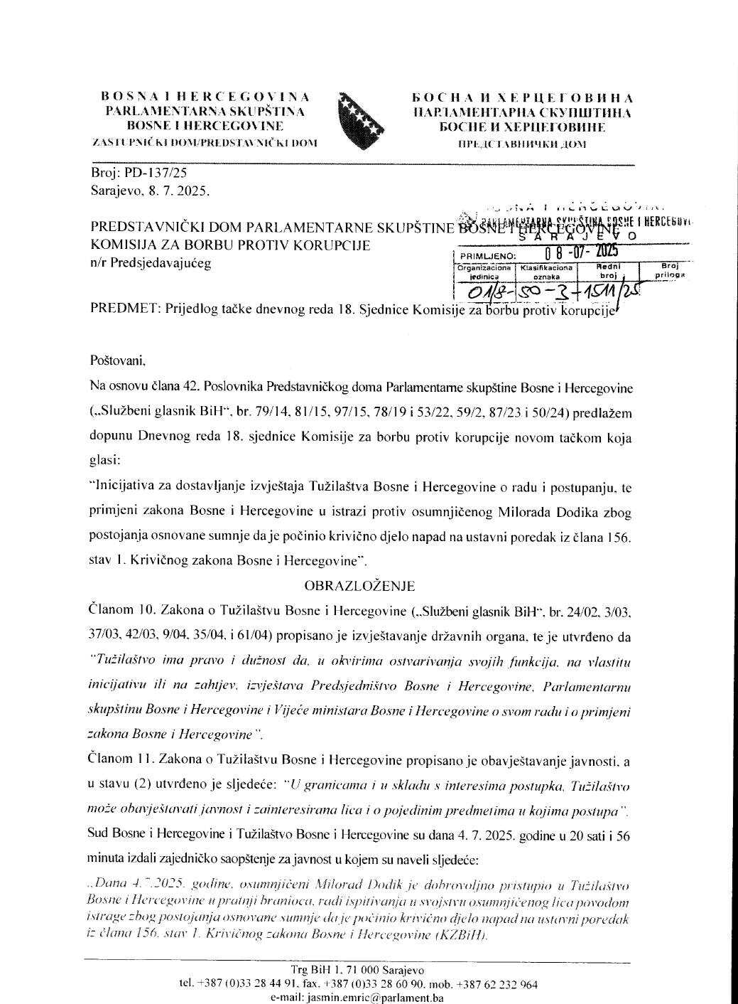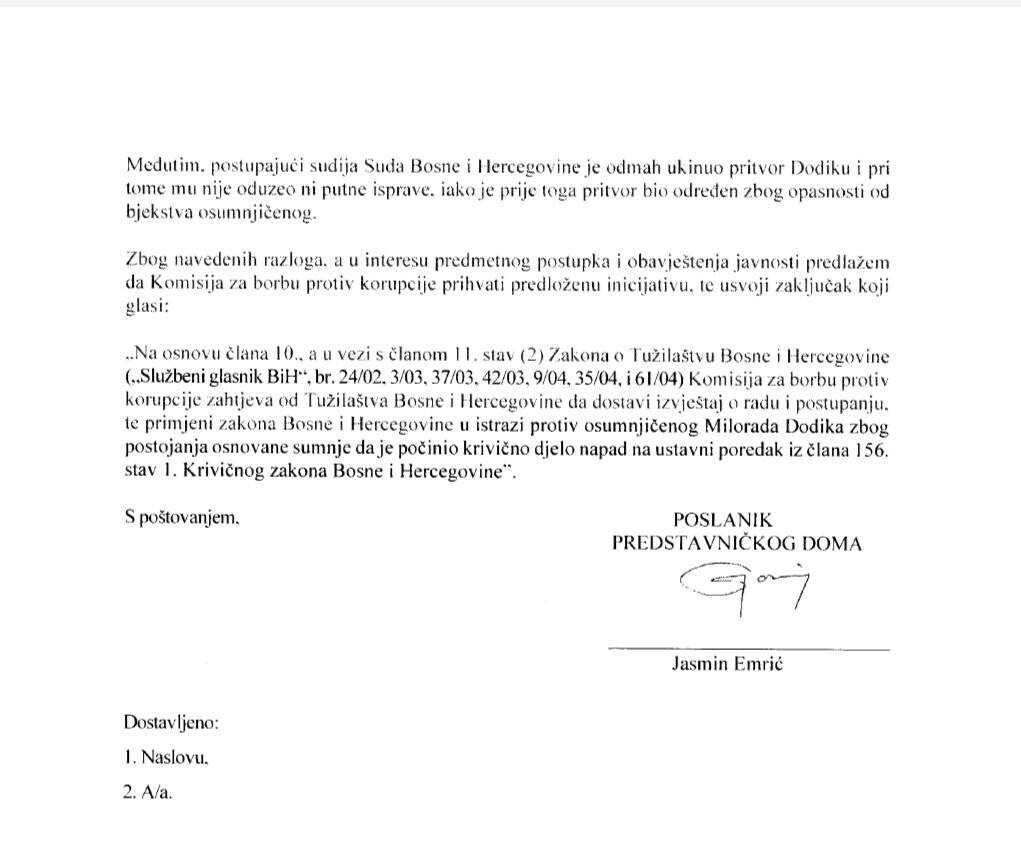 Zbog toga je zastupnik NES-a Jasmin Emrić uputio “Inicijativu za dostavljanje izvještaja Tužilaštva Bosne i Hercegovine o radu i postupanju, te primjeni zakona BiH u istrazi protiv osumnjičenog Milorada Dodika zbog postojanja osnovane sumnje da je počinio krivično djelo napad na ustavni poredak iz člana 156. stav 1. Krivičnog zakona BiH”.