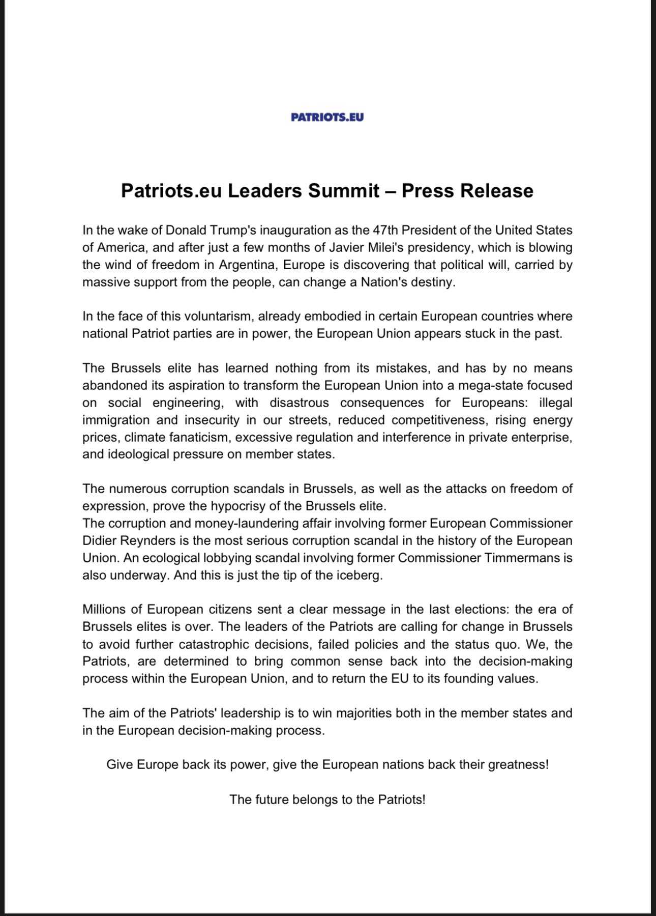 "Make Europe Great Again", upravo pod tim sloganom, inspiriranim onim "Make America Great Again" koji promovira predsjednik Sjedinjenih Država Donald Trump, planiraju se okupiti čelnici evropske parlamentarne grupe Patrioti za Evropu u hotelu u blizini madridskog aerodroma.