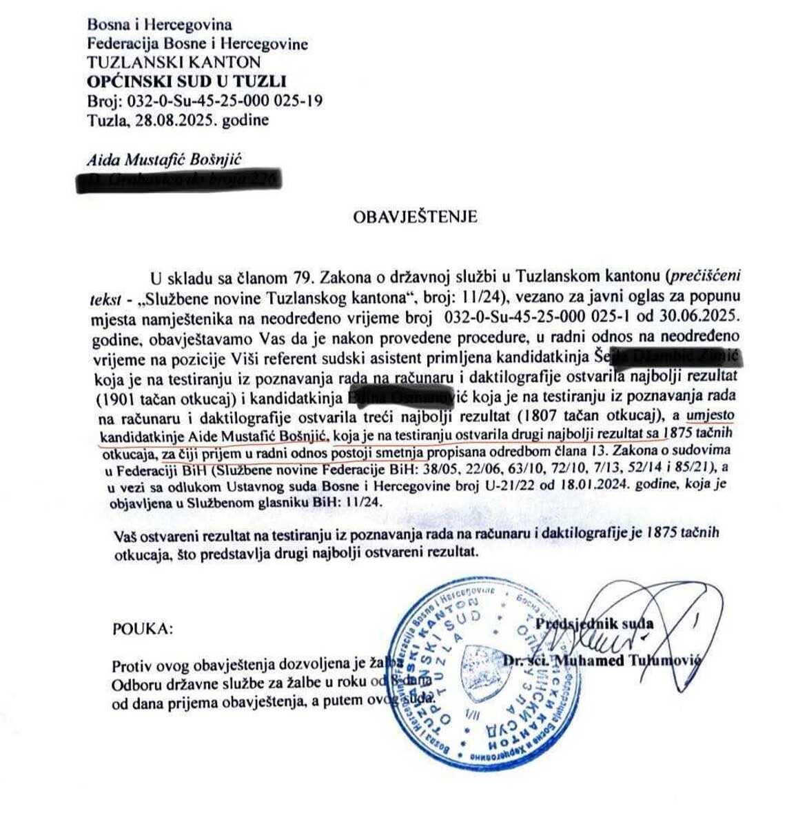 U konkretnom slučaju kandidatkinje Azre Okanović, predsjednik Općinskog suda u Tuzli, nakon što je primio listu kandidata koji su ispunili uslove iz javnog oglasa za prijem daktilografkinje, odlučio je zaposliti kandidatkinju koja je ostvarila sedmi najbolji rezultat, iako je kandidatkinja Azra Okanović ostvarila peti najbolji rezultat, piše Preporod.