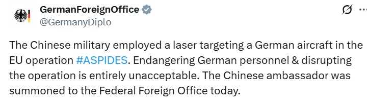 U utorak, 8. jula 2025, njemačko Ministarstvo vanjskih poslova javno je potvrdilo da je kineska vojska ciljala laserom na jedan njemački avion. Avion je bio angažovan u EU pomorskoj misiji Operation ASPIDES, koja od 2024. godine osigurava slobodu plovidbe u ključnim regijama – Crvenom moru, Omanskom i Persijskom zalivu, te Indijskom okeanu.