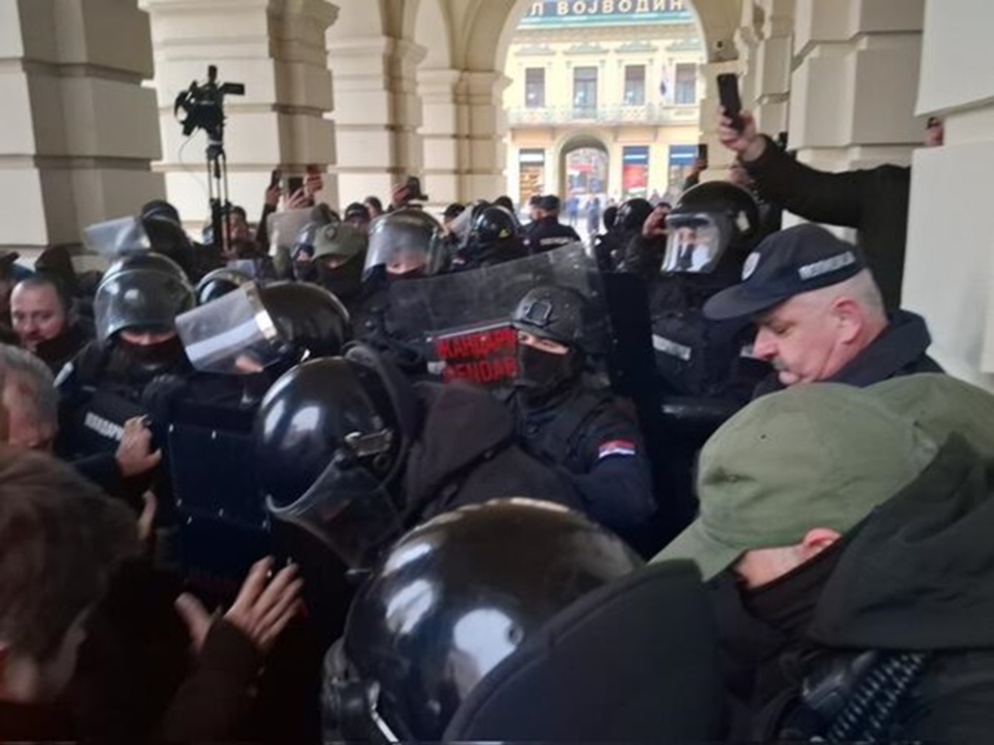 Predstavnici opozicije viču "Srbija, Novi Sad, ustali su sad". Oni tvrde da policija tuče ljude koji su ostali u zgradi.