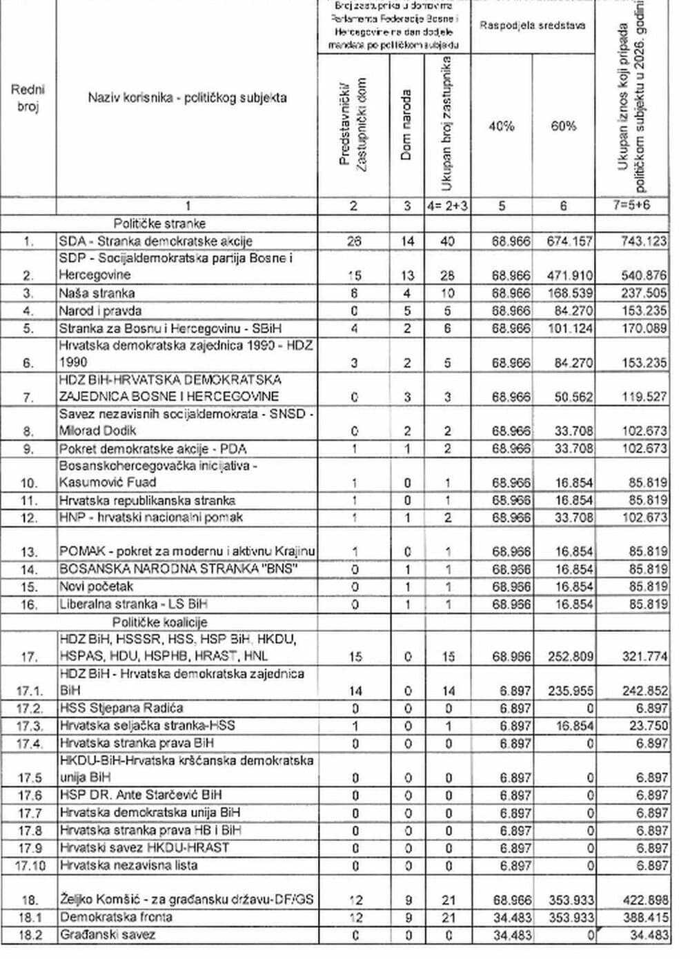Prema objavljenoj odluci i programu utroška, 40 posto ovog novca ide strankama u jednakim iznosima, a 60 posto prema broju zastupnika i delegata koje imaju u oba doma Parlamenta FBiH, tačnije koje su imali prema dodijeljenim mandatima.