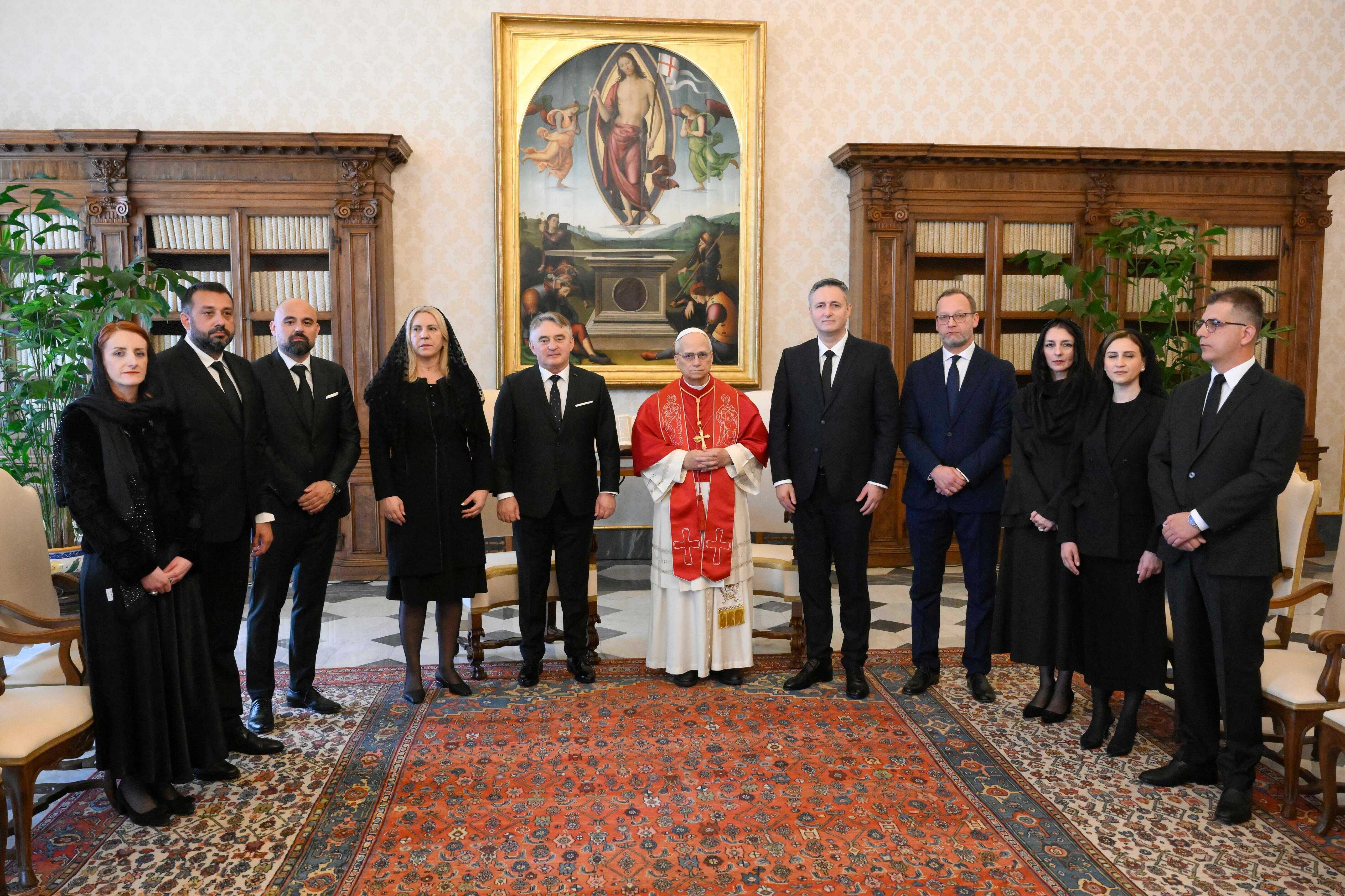 “Predsjedništvo BiH se sastalo sa Svetim ocem papom Lavom XIV u Vatikanu, Tokom sastanka potvrđeni su izuzetno prijateljski odnosi Bosne i Hercegovine i Svete stolice. Članovi Predsjedništva BiH prenijeli su pozdrave uime BiH te izrazili zahvalnost na kontinuiranoj podršci koju Sveta stolica pruža našoj zemlji, uz nadu da će se ta podrška nastaviti i u budućnosti.Članovi Predsjedništva BiH izrazili su zahvalnost papi Lavu XIV i Svetoj stolici na podršci koju su do sada pružali Bosni i Hercegovini, na njegovim porukama mira, solidarnosti i nade koje imaju poseban odjek u društvu. Članovi Predsjedništva BiH izrazili su spremnost Bosne i Hercegovine da doprinosi jačanju multilateralizma i očuvanju univerzalnih vrijednosti. Predsjedništvo BiH je pozvalo papu Lava XIV da posjeti Bosnu i Hercegovinu. Članovi Predsjedništva BiH su darovali unikatni srebreni bareljef rozete koja se nalazi na pročelju Katedrale Srca Isusova u Sarajevu. Poslije susreta sa Papom Lavom XIV članovi Predsjedništva BiH su razgovarali sa sekretarom za odnose s drugim državama i međunarodnim organizacijama Državnog sekretarijata Svete stolice nadbiskupom Paulom Richardom Gallagherom. Razmijenjena su mišljenja o aktuelnoj političkoj i društvenoj situaciji u BiH, kao i o regionalnim i globalnim izazovima. Posebno je naglašena važnost očuvanja stabilnosti i institucionalne funkcionalnosti. Naglašeni su važnost konstruktivnog političkog dijaloga, jačanje vladavine prava i unapređenje međusobnog povjerenja”, navedeno je u saopćenju.