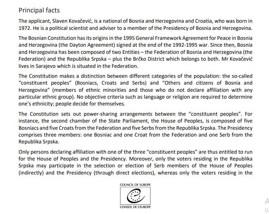 Ustav BiH, nastao na osnovu Dejtonskog mirovnog sporazuma iz 1995. godine, uspostavlja podjelu stanovništva na „konstitutivne narode“ (Bošnjaci, Hrvati i Srbi) i „Ostale“ i građane BiH. Samo osobe koje se izjašnjavaju kao pripadnici konstitutivnih naroda mogu se kandidirati za Dom naroda i Predsjedništvo. Pored toga, glasačko pravo za predstavnike u tim institucijama zavisi od entitetske pripadnosti birača.