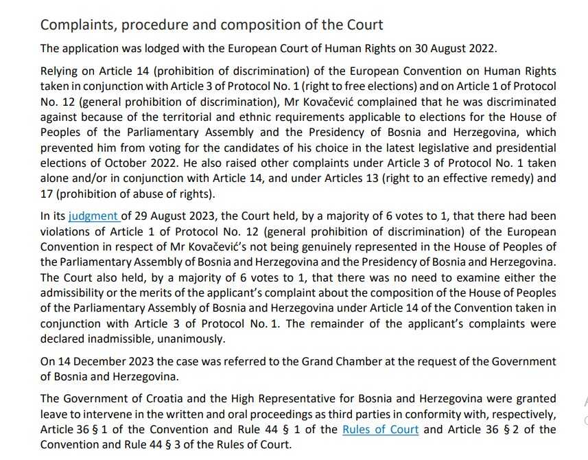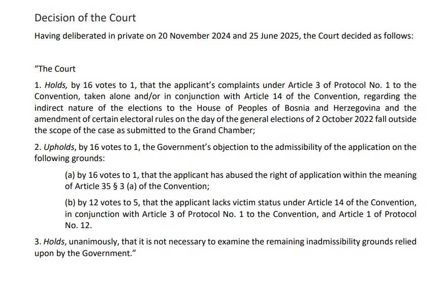 Sud je jednoglasno zaključio da nije potrebno razmatrati ostale osnove neprihvatljivosti na koje se pozivala Vlada, prenosi Politicki.ba zakljucke (NE PRESUDU!) Suda u Strazburu.