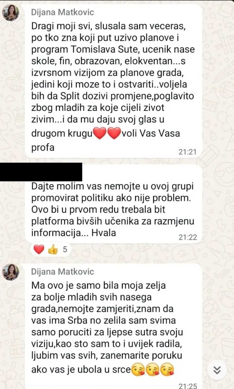 Profesorica u splitskoj gimnaziji Diana Matković (60) u aplikaciji za razmjenu poruka pozivala je svoje bivše učenike, kao i roditelje djece kojima je razrednica da glasaju za kandidata HDZ-a na lokalnim izborima, te navodila da ne voli Srbe ni Jugoslovene, prenosi Index.