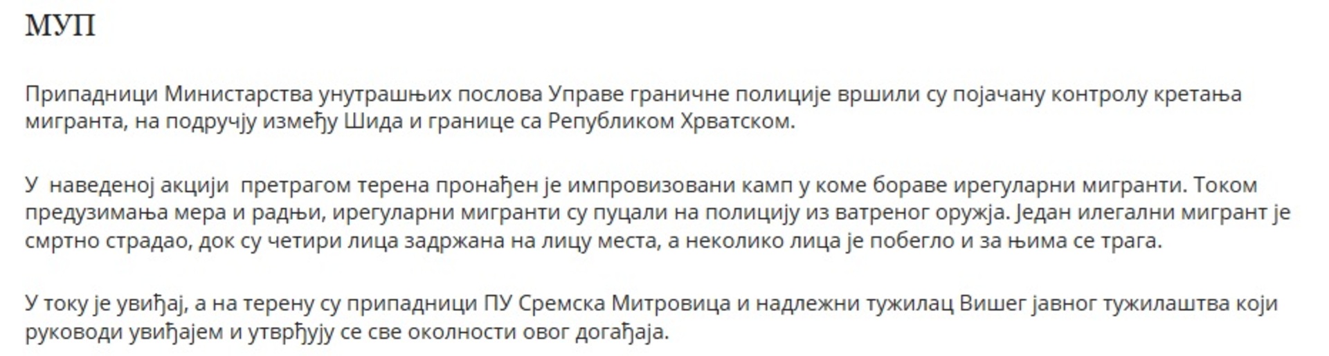 Ministarstvo unutrašnjih poslova Srbije saopćilo je da su večeras tokom pojačane kontrole kretanja migranta na području između Šida i granice sa Hrvatskom, ilegalni migranti pucali na policiju iz vatrenog oružja i da je tada jedan ilegalni migrant smrtno stradao, dok su četiri lica zadržana na licu mjesta, a nekoliko je pobjeglo i za njima se traga.