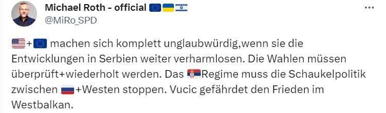 Michael Roth, jedan od potpredsjednika vladajuće Socijaldemokratske partije Njemačke (SPD) i predsjednik Komiteta za vanjsku politiku Bundestaga zatražio je ponavljanje izbora u Srbiji.