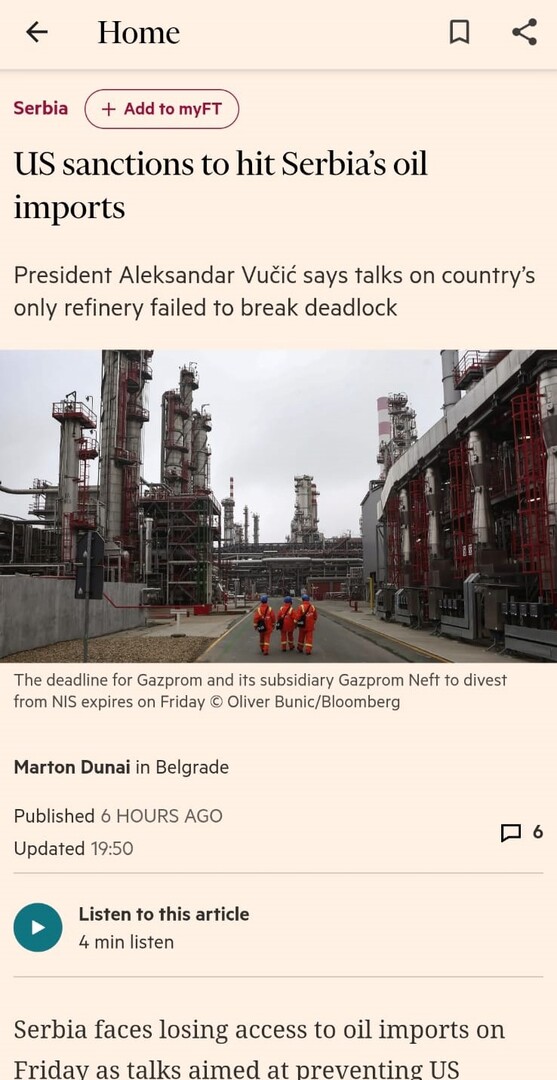Produženi rok da se ruski vlasnici izbace iz NIS-a ističe u petak, a predsjednik Srbije Aleksandar Vučić je rekao da ne očekuje da će dogovor u poslednjem trenutku sprečiti krizu", piše Financial TImes.