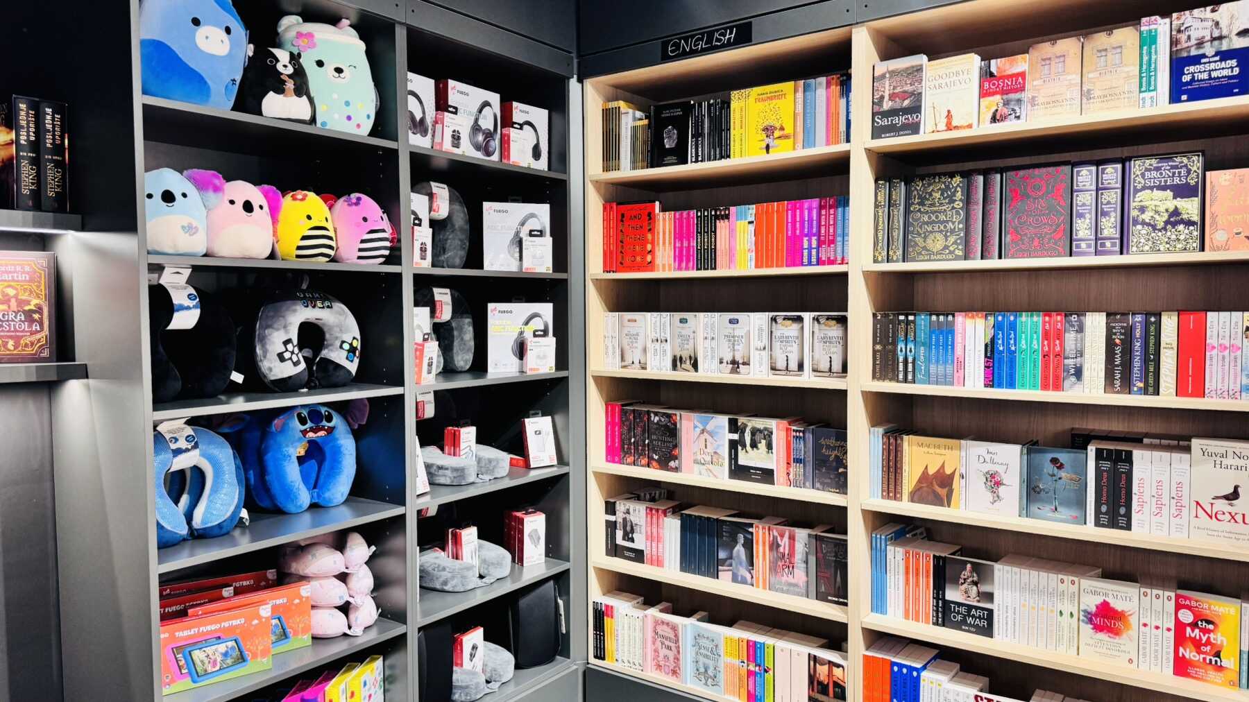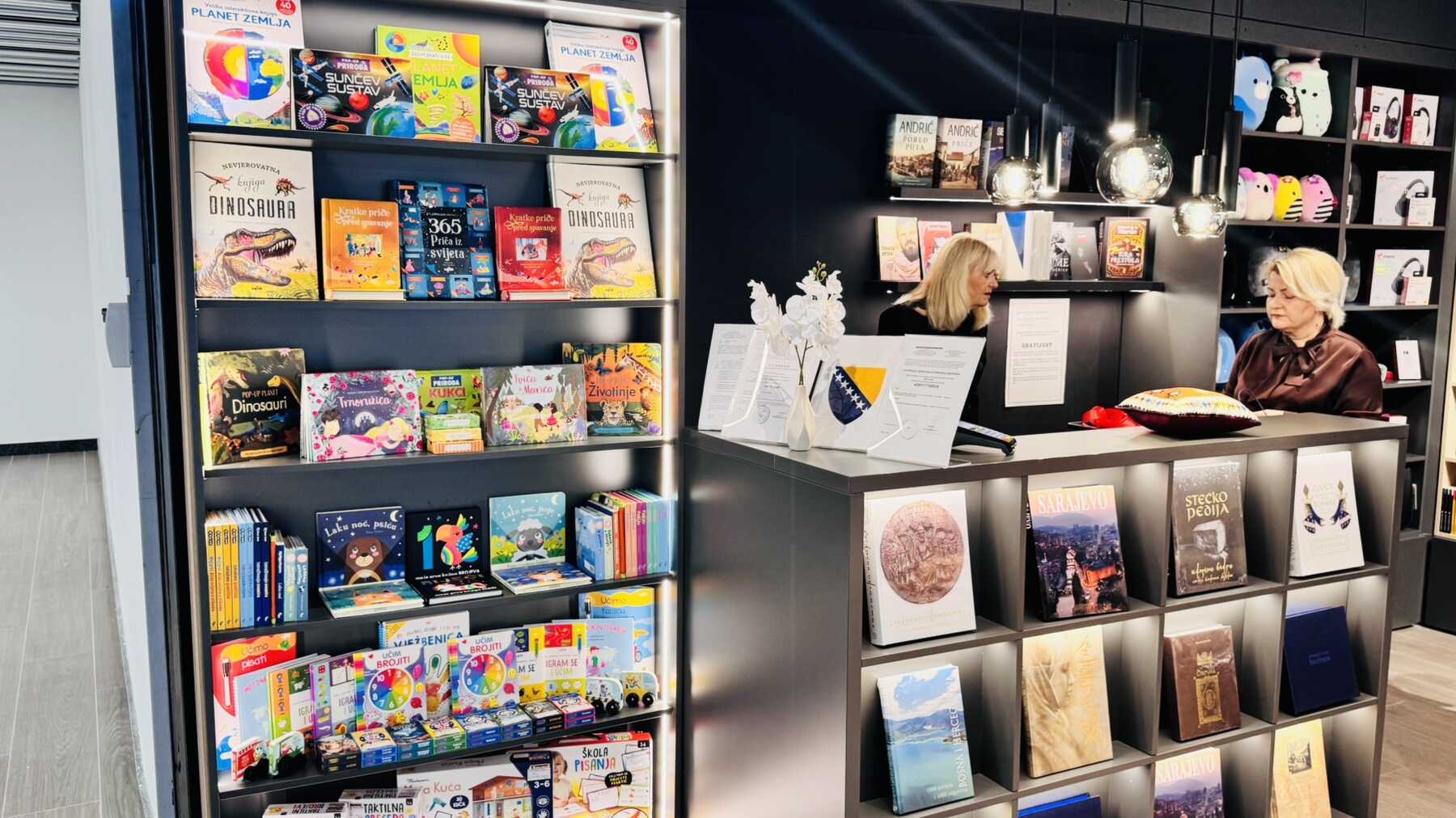 Ovaj jedinstveni prostor nije samo prodajno mjesto, već prava mala oaza za ljubitelje knjige. Police su ispunjene pažljivo biranim naslovima – od klasika svjetske književnosti, preko savremene proze i publicistike, do putopisnih izdanja i poklona koji nose duh Bosne i Hercegovine. Poseban akcenat stavljen je na domaće autore i izdanja koja čitatelja podsjećaju da se najljepše priče često nalaze upravo kod kuće.