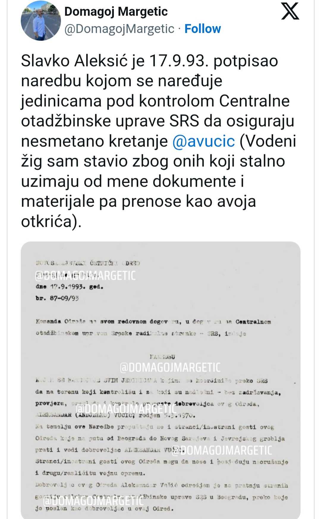 U dokumentu kojeg je objavio Margetić, Aleksić naređuje jedinicama pod kontrolom Centralne otadžbinske uprave SRS da "bez zadržavanja, provjera, pregleda i kontrole propuste dobrovoljca ovog odreda Aleksandra (Anđelka) Vučića, rođenog 5. marta 1970. godine".