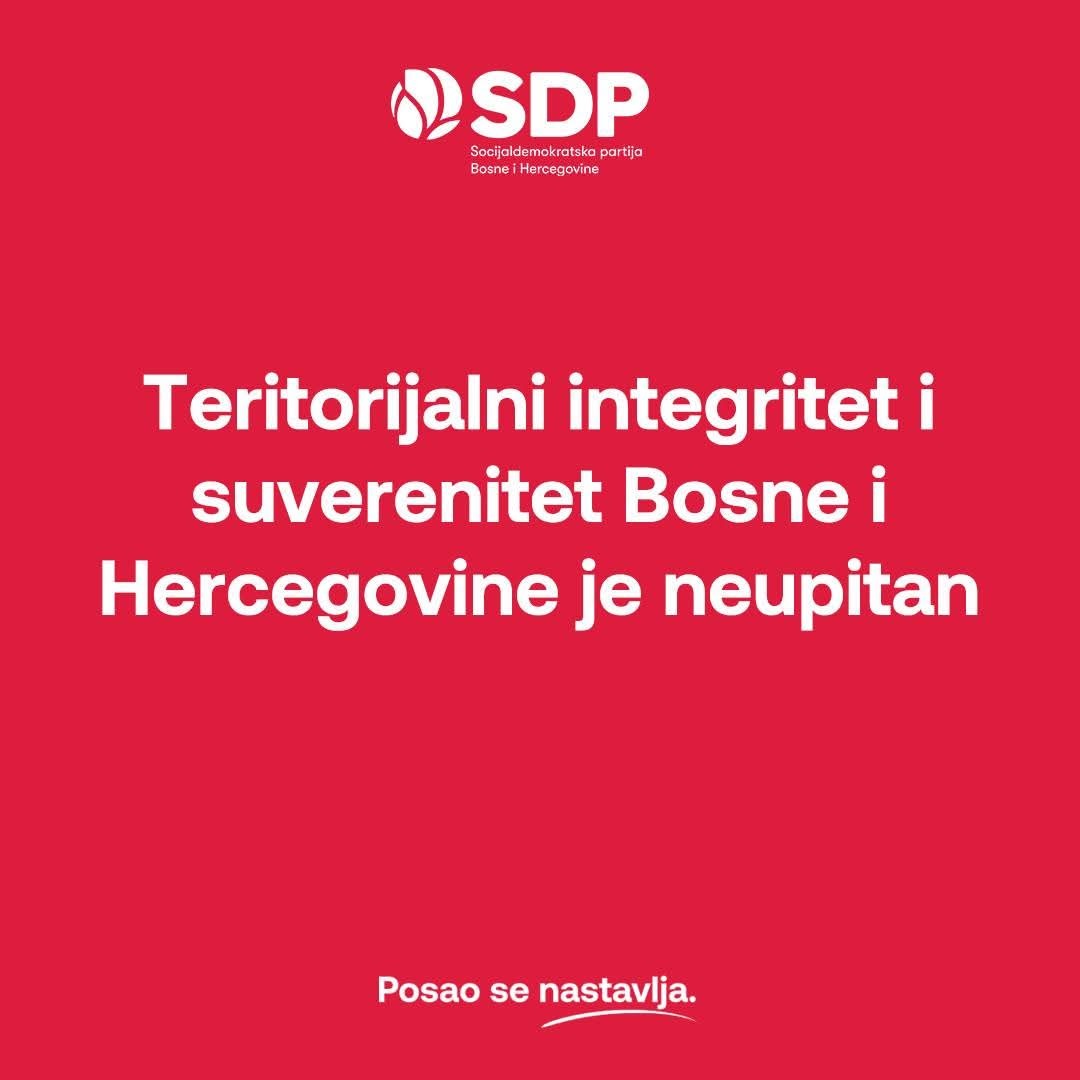 "SDP BiH će nastaviti dosljedno i bez kompromisa braniti ustavni poredak, teritorijalni integritet i suverenitet Bosne i Hercegovine, te poziva sve domaće i međunarodne aktere da jasno, glasno i bez zadrške odbace svaki narativ koji vodi ka novim podjelama, ali i da konkretno podrže reformske procese koji Bosnu i Hercegovinu vode ka stabilnoj, funkcionalnoj i evropskoj državi."