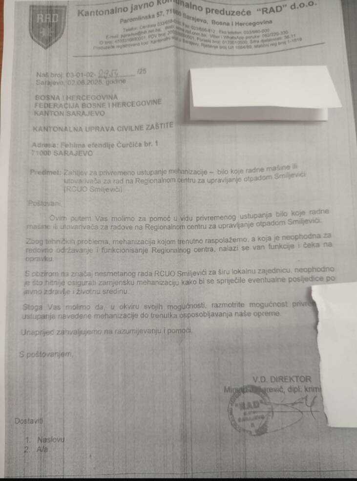 Izetbegović je u objavi na Facebooku navela da KJKP Rad trenutno nema mehanizaciju za normalno funkcionisanje, te da v. d. direktora tog preduzeća traži od Kantonalne uprave Civilne zaštite da im posudi bilo kakvu mašinu radi održavanja deponije Smiljevići.