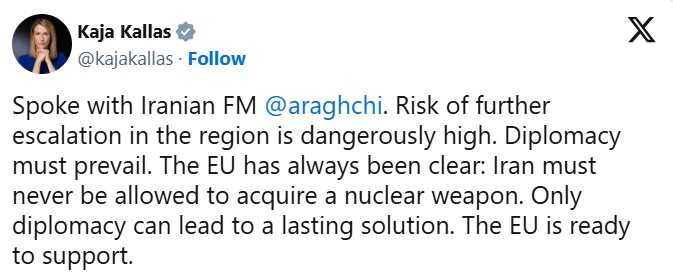 – EU je oduvijek bila jasna: Iranu se nikada ne smije dopustiti da stekne nuklearno oružje. Samo diplomatija može dovesti do trajnog rješenja – rekla je Kallas.
