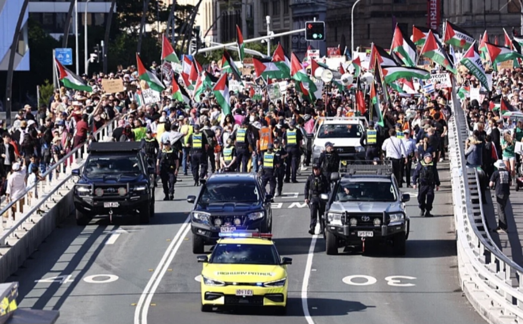 Organizatori su saopćili da procjenjuju da danas maršira najmanje 100.000 ljudi te da će nastaviti marširati dok Australija ne uvede sankcije, protjera izraelske diplomate i procesuira Australce koji su služili u IDF-u u bombardiranju Gaze.