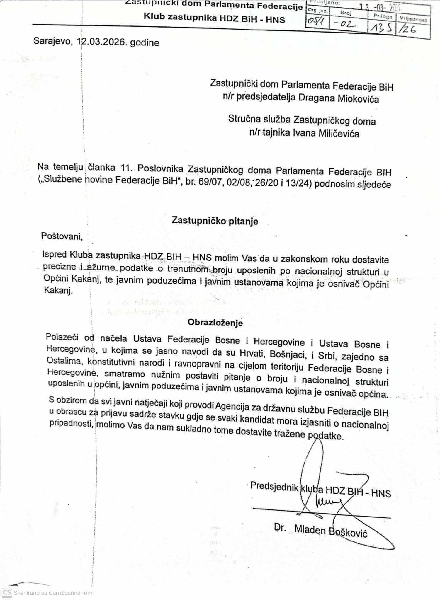 Mladen Bošković (HDZ), zamjenik predsjedavajućeg Zastupničkog doma Parlamenta FBiH i predsjednik Kluba HDZ-HNS, službenim putem zatražio je podatke o nacionalnoj strukturi zaposlenih u Općini Kakanj, javnim preduzećima i ustanovama čiji je Općina osnivač.