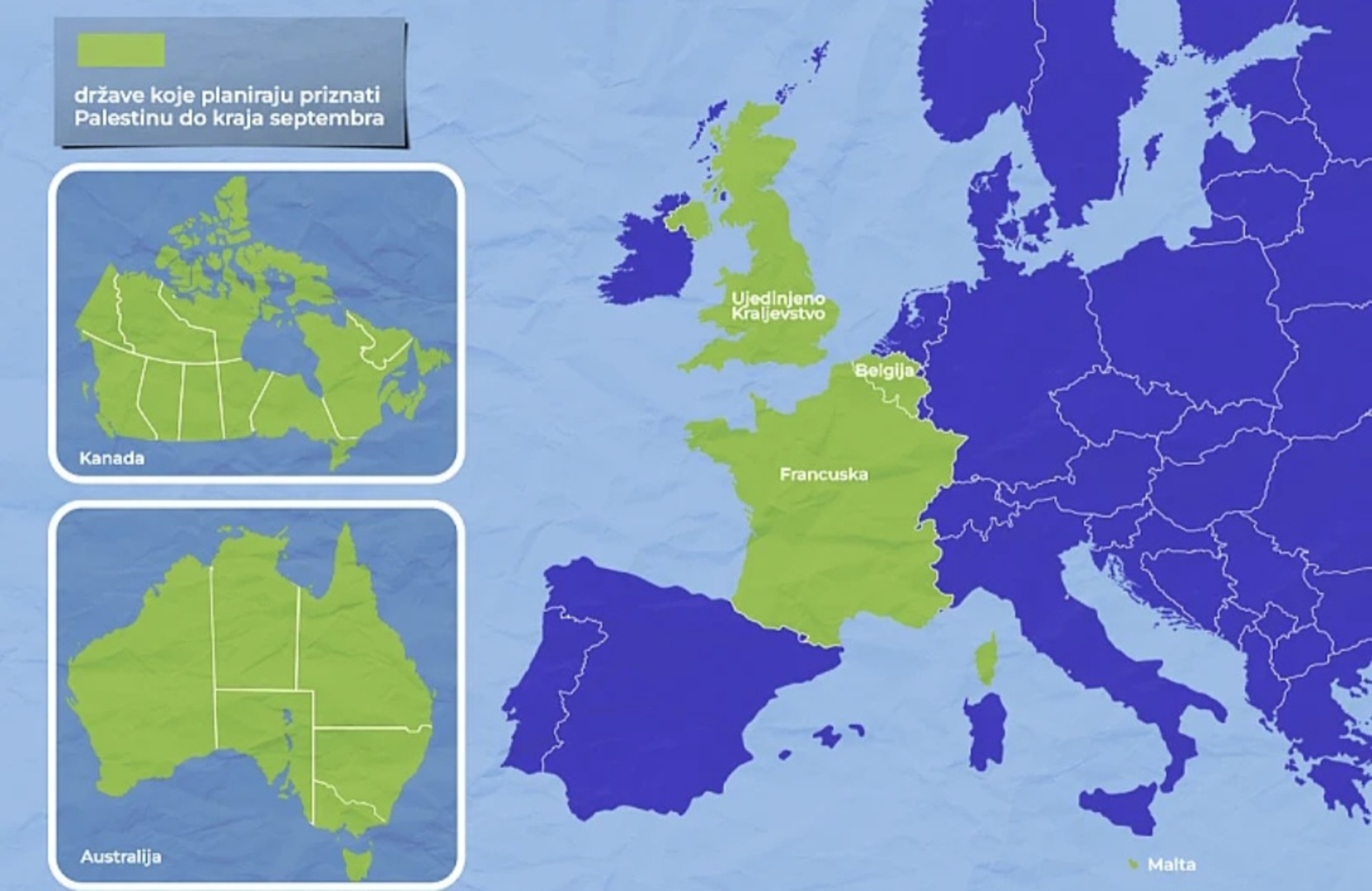 Otočna Malta je najavila da će priznati Palestinu u septembru, a Belgija je također najavila formalno priznanje u septembru, ali koje bi se finalizovalo kraljevskim dekretom tek nakon što svi zarobljenici koje Hamas drži budu oslobođeni.