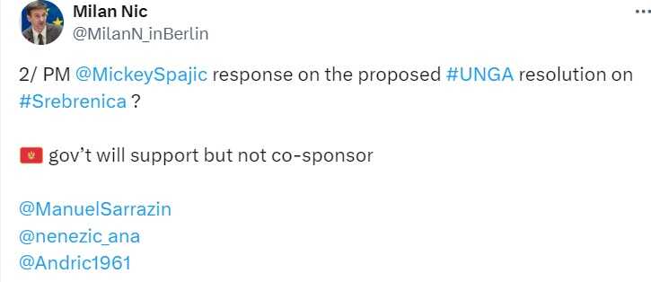 Crna Gora će podržati usvajanje Rezolucije Ujedinjenih nacija o genocidu u Srebrenici, prenosi Politicki.ba.