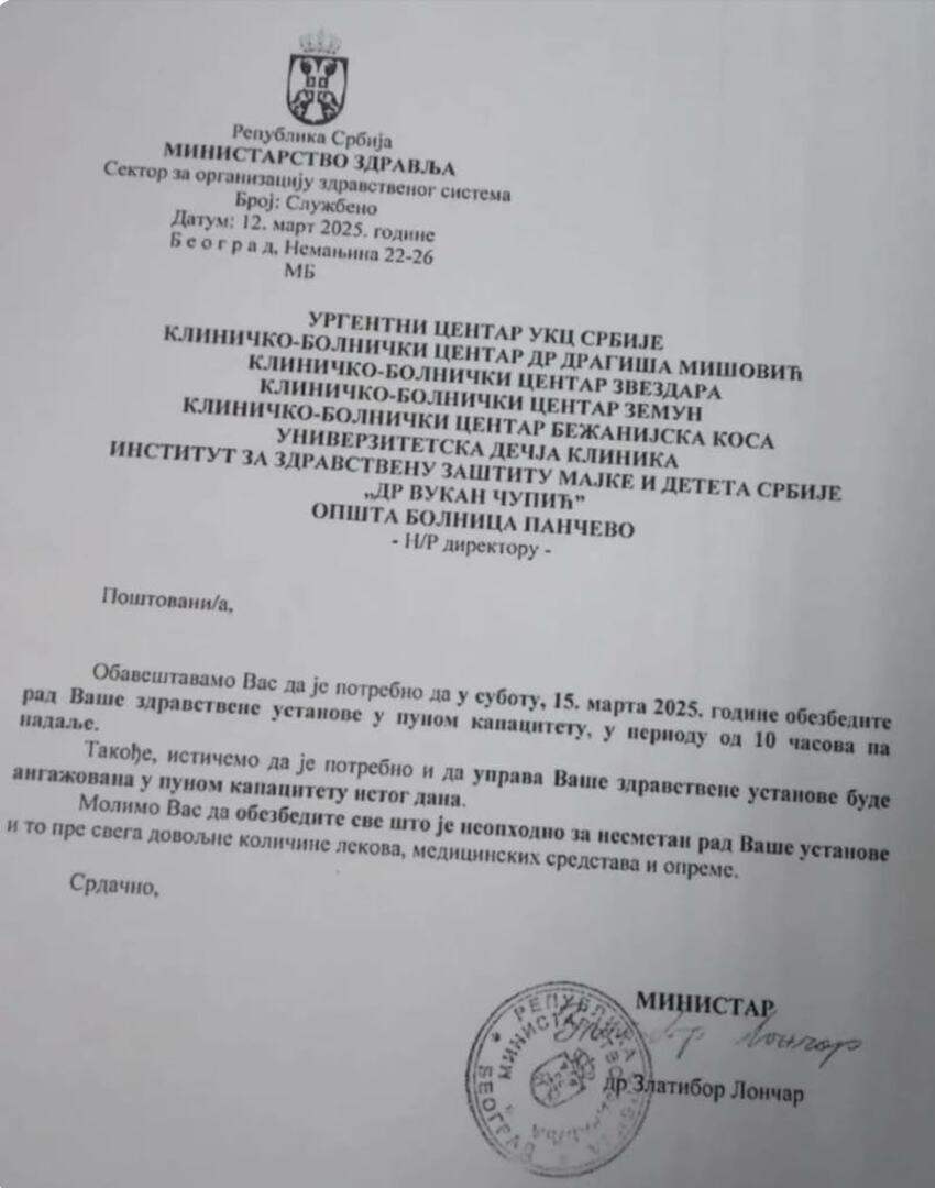 Uposlenici Urgentnog centra Srbije, te svih ostalih bolničkih kompleksa u Beogradu, uključujući čak i Univerzitetsku dječiju kliniku, dobili su naredbu da sutra, 15. marta 2025. godine, rade u punom kapacitetu.