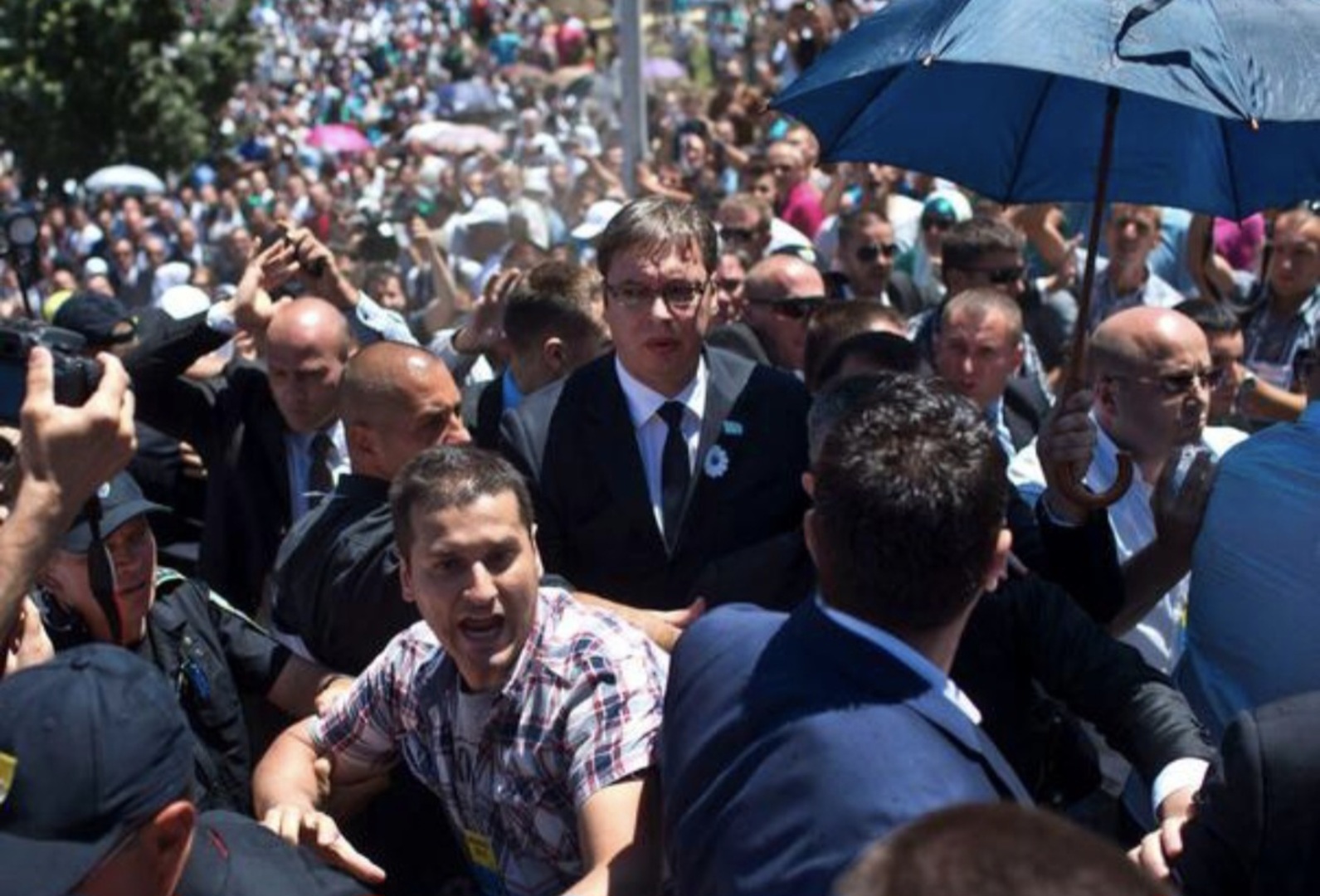 šćenja".Ali događaj je dobio sasvim drugačiji tok. Nakon što je Clinton položio vijenac, Vučić je položio cvijet, ali ubrzo je atmosfera eskalirala. Započelo je dobacivanje, a zatim su prema Vučiću poletjele boce i kamenje. Gledajući snimke danas, čudo je da niko nije ozbiljno povrijeđen.