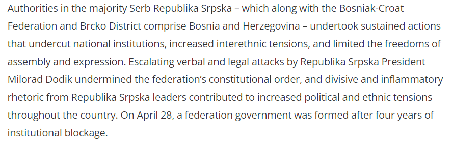 Vlasti u većinski srpskom entitetu Rs – koja zajedno sa bošnjačko-hrvatskom Federacijom i Brčko Distriktom čine Bosnu i Hercegovinu – poduzele su kontinuirane akcije koje su potkopale nacionalne institucije, povećale međuetničke tenzije i ograničile slobodu okupljanja i izražavanja. Eskalacija verbalnih i pravnih napada predsjednika Rs Milorada Dodika ugrozila je ustavni poredak BiH, a zapaljiva retorika podjela lidera Rs doprinijela je povećanju političkih i etničkih tenzija u cijeloj zemlji.