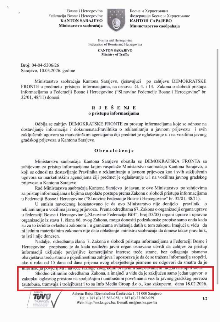 “Zaključen je samo jedan ugovor o zakupu oglasnog prostora na spoljašnjim i unutrašnjim površinama vozila javnog gradskog prijevoza (autobusa, tramvaja i trolejbusa) i to sa firmom Info Media Group, kao zakupcem, dana 18.02.2026.”, jasno stoji u odgovoru.