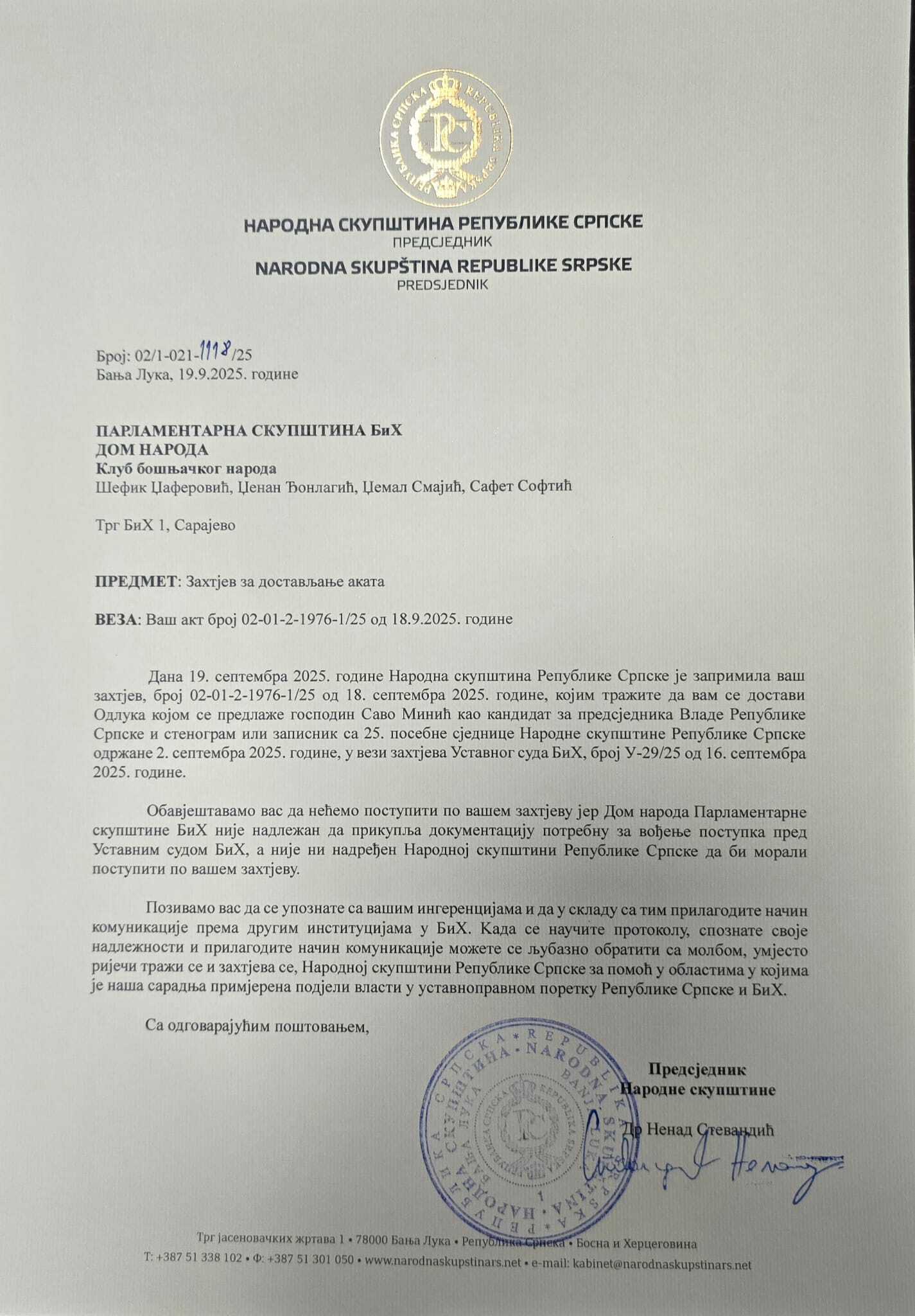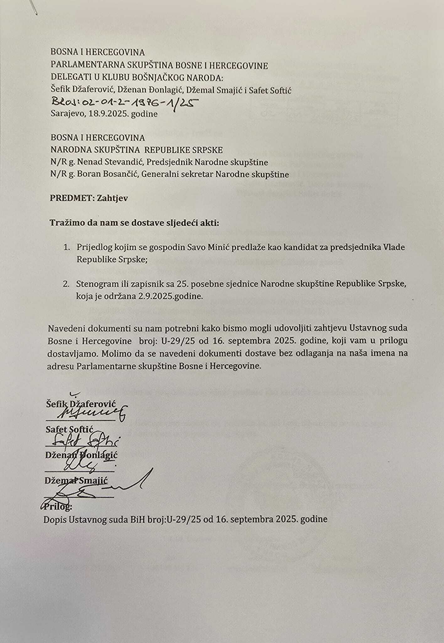 Ranije smo objavili da je odbio delegatima bošnjačkog naroda Šefiku Džaferoviću i Safetu Softiću iz SDA, Džemalu Smajiću iz Stranke za BiH i Dženanu Đonlagiću iz DF-a dostaviti akt na osnovu kojega je za "premijera" Rs imenovan Savo Minić.