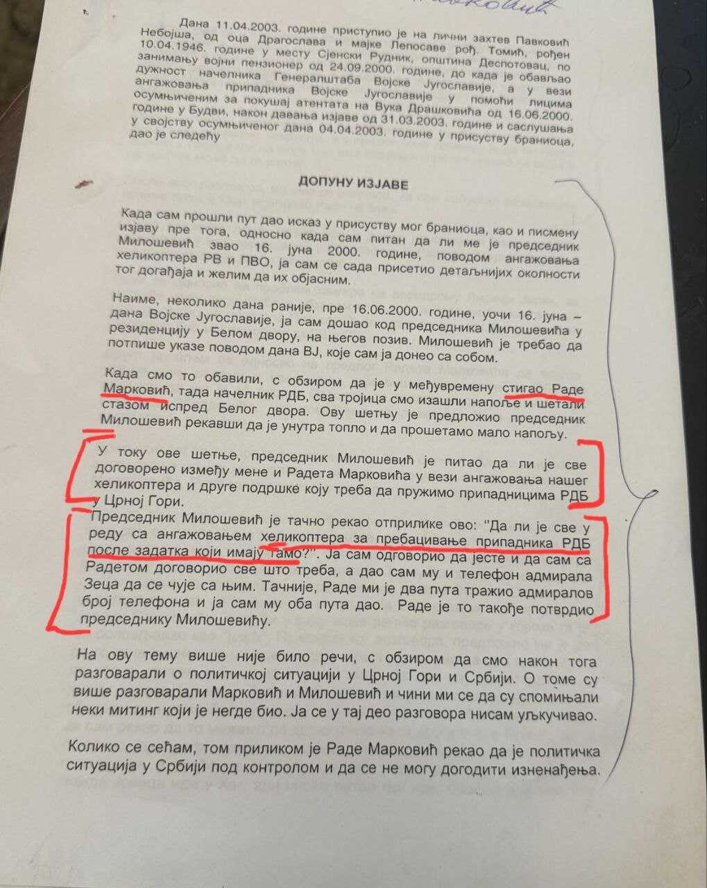 "Na ovom zapisniku Pavković priznaje da je sa R. Markovićem i Slobodanom Miloševićem dogovorio da vojne jedinice kojima je komandovao, nakon atentata, izvuku atentatore na Draškovića."