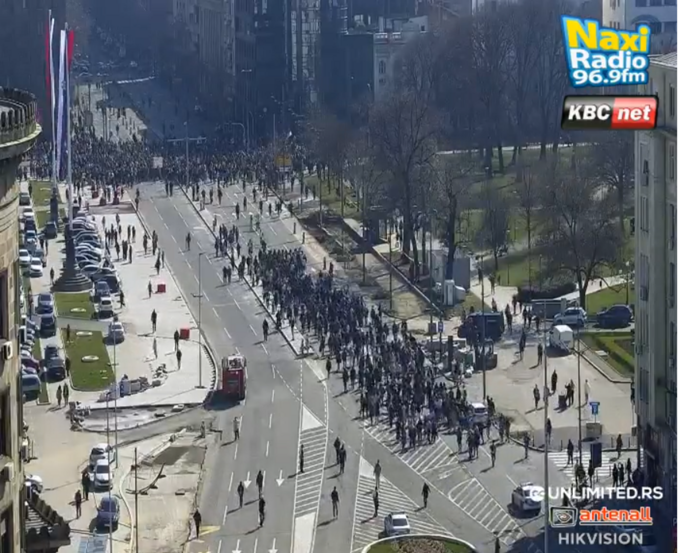 Nakon što je u Skupštini Srbije izbila tuča među poslanicima, te bačene baklje, oni su se svi usmjerili prema parlamentu.