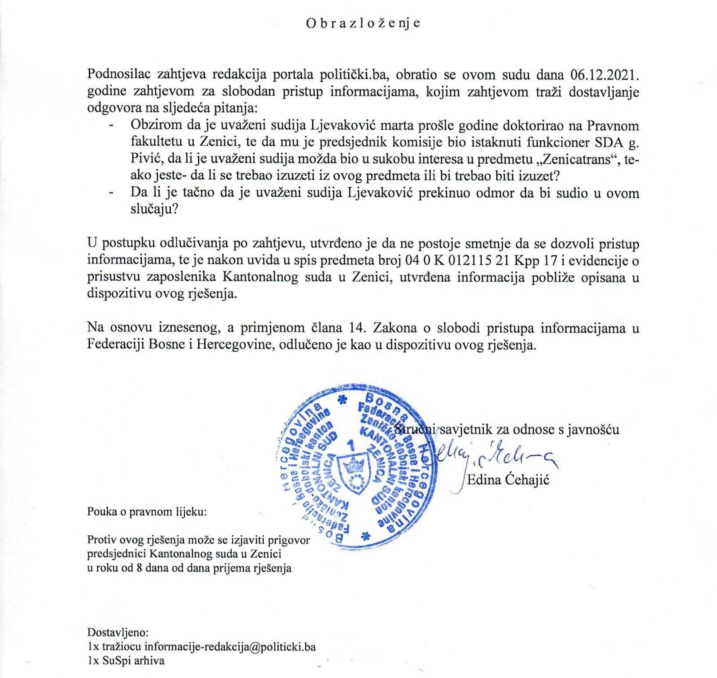Poizilazi to iz odgovora Suda Zeničko-dobojskog kantona na naš upit da li je ovaj sudija mogao postupati u predmetu, obzirom da je pred Nezirom Pivićem, aktuelnim predsjednikom zeničke SDA i profesorom na Prvnom fakultetu u Zenici, sudija Ljevaković 20. marta prošle godine odbranio doktorat.