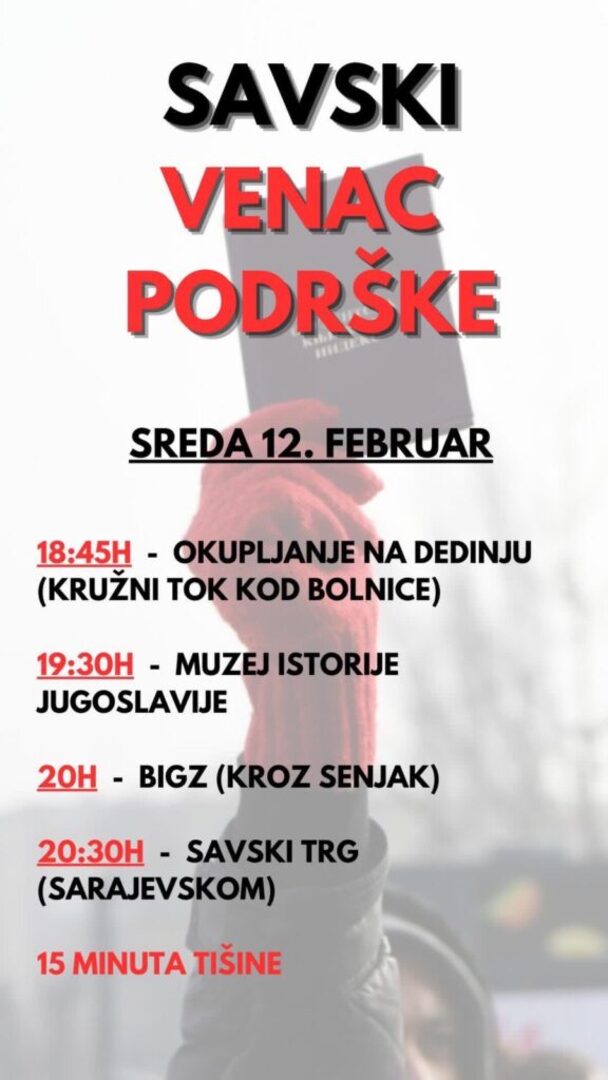 Prema programu, građani Opštine Savski Venac u Beogradu sutra će se okupiti u 18:45 sati na Dedinju, nakon čega se u 19:30 očekuje i okupljanje kod Muzeja Jugoslavije.